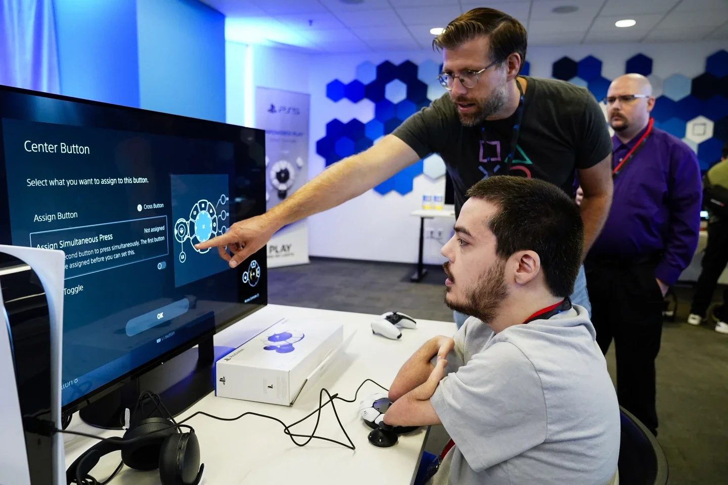 Brian Parsons showing gamer how to customize Access Controller mapping at media event for the controller’s launch at the PlayStation headquarters in San Mateo, California. Photo Credit - AP Photo/Godofredo A. Vásquez